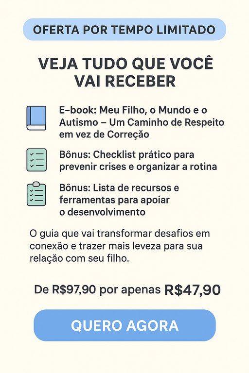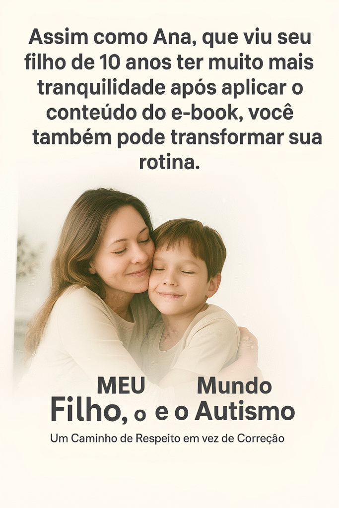 No e-book Meu Filho, o Mundo e o Autismo – Um Caminho de Respeito em vez de Correção, você vai encontrar orientações simples, práticas e acolhedoras para reduzir crises sensoriais e emocionais, fortalecer o vínculo e viver dias mais leves com seu filho. Sem jargões, sem culpa, com muito amor e respeito.